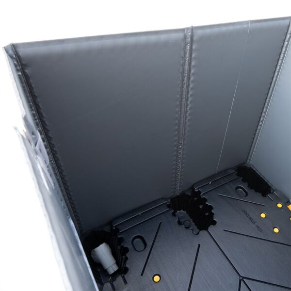 WANDEN: 10-11 mm dik, slagvast gelamineerd polypropyleen (PP) plaatmateriaal met cellenstructuur. Gewicht tussen 2.500 - 4.500 gr./m2 passend bij verschillende belastingscapaciteiten. Op aanvraag 18 mm wanden beschikbaar