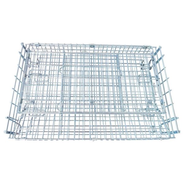 most commonly a mesh wire cage has one drop-down gates on the front side.